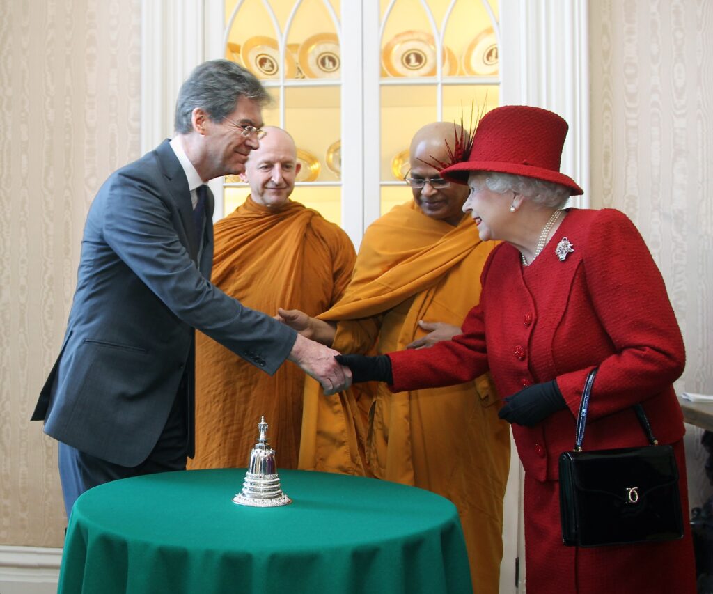 Dr Desmond Biddulph CBE, President The Buddhist Society, Venerable Amaro, Venerable Seelawimala, with Her Majesty The Queen for the Diamond Jubilee.