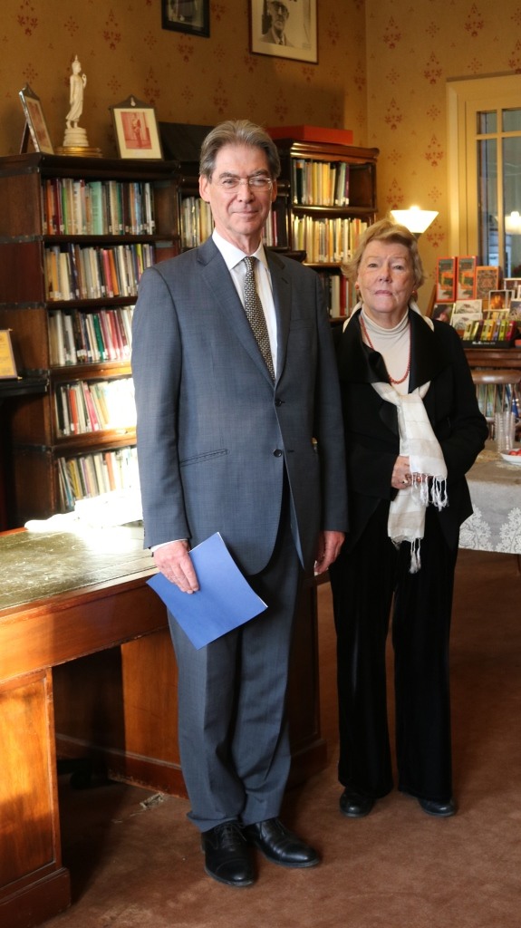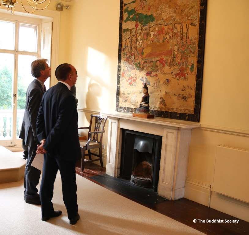 Lord Bourne of Aberystwyth, Parliamentary Under Secretary of State at the Department for Communities and Local Government and Dr Desmond Biddulph CBE, President, The Buddhist Society in the Lecture Room of the Buddhist Society. August 2016