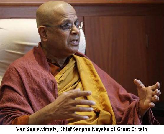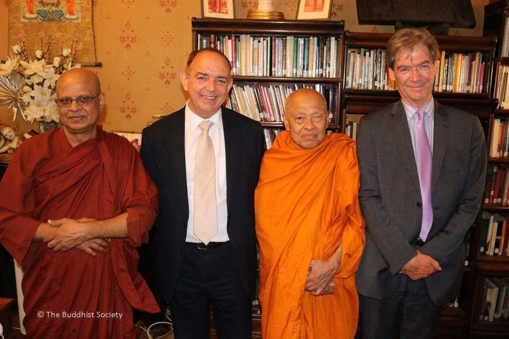 Ven Seelawimala, Chief Sangha Nayaka, London Buddhist Vihara, Lord Bourne of Aberystwyth, Ven Phrakru Samulom, Buddhapadipa Temple, Wimbledon, and Dr Desmond Biddulph CBE, President of The Buddhist Society in its Library.